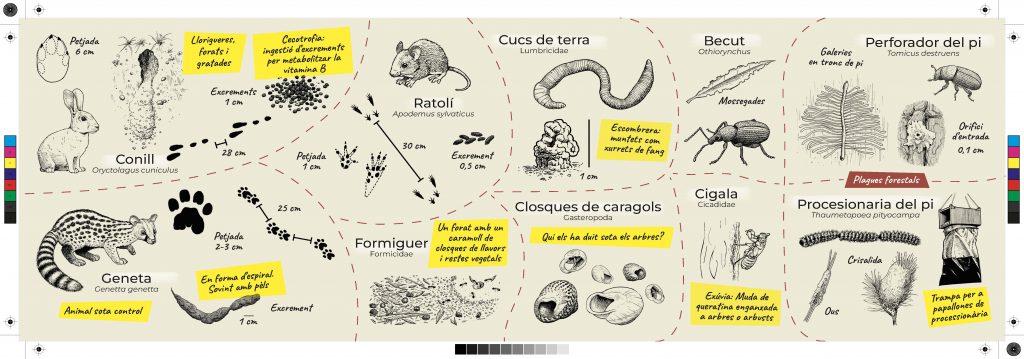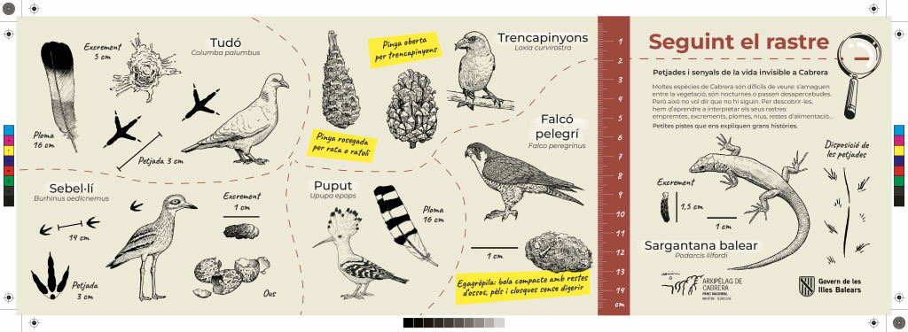 Realizamos el diseño y maquetación de un tríptico sobre las huellas y rastros que deja la fauna de la isla de Cabrera en Baleares. Con las magníficas ilustraciones de Pau Oliver, ilustrador científico de Mallorca.